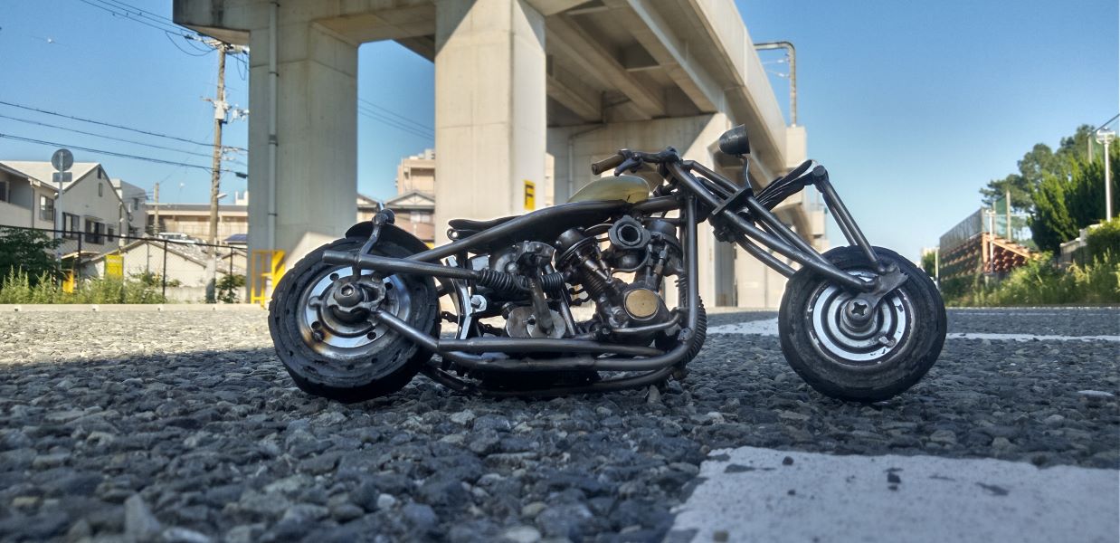メカニカル抜群なカスタムハーレーに魅了されできる限り細かな部分を再現する思いで製作。約160X130mmサイズになりました。