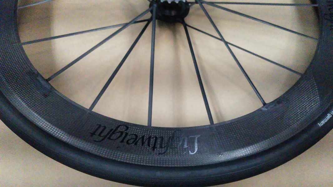 Lightweightカーボンホイール・リムとカーボンスポークの付け根2ヶ所が剝離・エポキシ樹脂で固着・狭い範囲ですがカーボンを4層巻き・更に剝離防止にエポキシ樹脂で固着・クリアー塗装仕上げ。