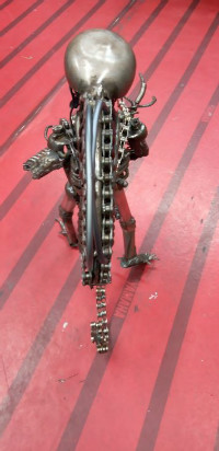 30年前の大きなベルを潰して頭・体はサスベー・サドルのレール・尻尾はチェーン・腕にはネジくぎ・胸は泥除けステー・よだれはスポーク・まだまだいっぱい。眼・胸は光ます。こわ~いーです。